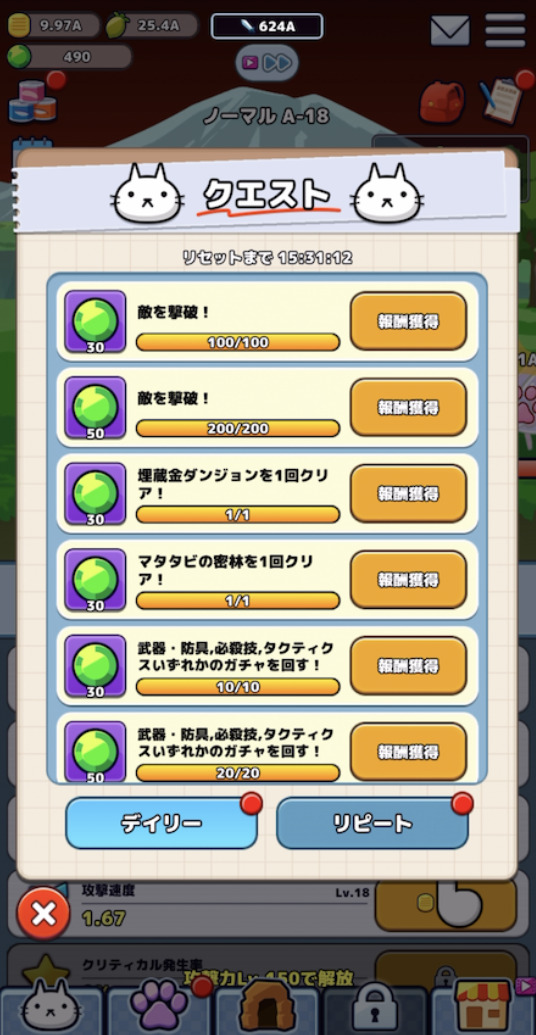 魔物との戦闘は全て自動で進行します。プレイヤーが直接操作する必要がないため、放置していてもネコたちが自動的に敵を倒し、経験値やアイテムを獲得してくれます。