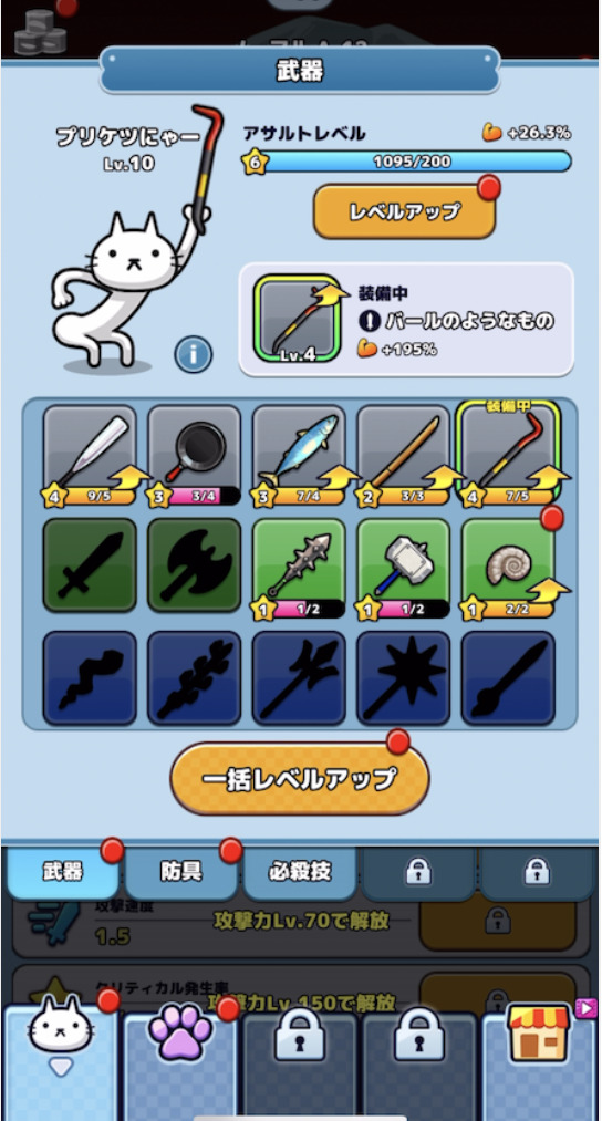 入手した装備は、不要な装備を素材にしてレベルアップが可能です。装備を強化することで、プリケツにゃーの基礎攻撃力が上昇し、戦闘を有利に進められます。