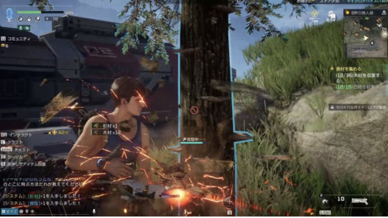 本作では、サバイバルの基本となる「資源採取」と「クラフト」が重要な役割を果たします。木材、金属、電子部品などの素材を集め、それらを組み合わせて武器や防具を作成することで、戦闘能力を強化できます。